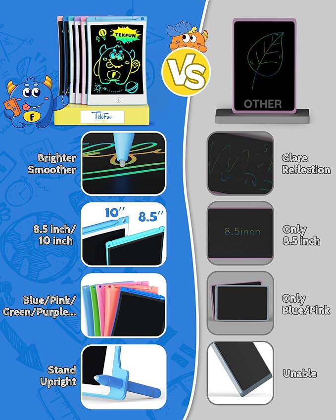 • Eye-protecting Colorful Screen: Eyes Are The Window To The Soul. Too much screen time on electronics will hurt kids' eyesight. The TEKFUN doodle board LCD screen with no blue light, no glare, radiation-free, but can depict a dreamy and colorful world and writes in "rainbow". Eyes will not be tired at all even for long-time use.