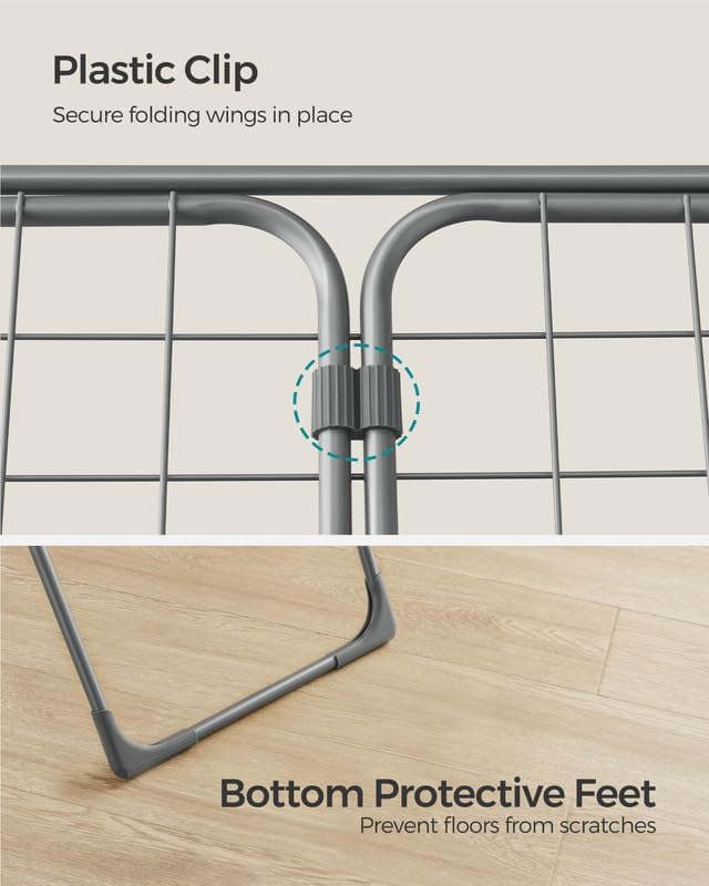 • [Thoughtful Details] This drying rack features a smooth-sliding loop, a plastic clip that keeps wings securely in place when folded, and floor-friendly plastic feet