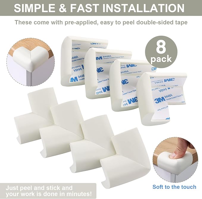 • Safety Corners For Furniture :Use our child proof corner guard on sharp corners in your home to prevent any accidental scrapes from your child running into corners. Our Childproof Corner Protectors will stick to nearly any surface using long-lasting double sided tape. Use them on wood, glass, steel, and ceramic surfaces to baby-proof your home today