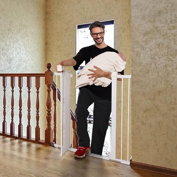 • EASY & SAFETY LOCK: The baby gate is easy to install on the wall, and it has a walk-in door with double lock lever handles, allowing adults to easily unlock and lift the baby gate with one hand but it is difficult for babies. It is very suitable for stairways or doorways