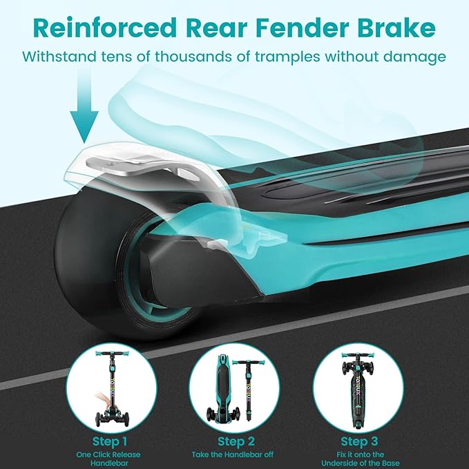 • 【Safe and Durable】 The progressive braking system prevents the scooter for kids ages 6-12 from rolling over due to sudden braking. The aluminum alloy reinforced frame, high-strength structural and SUV-level 5.11'' widened pedals allow the actual bear weight 110lbs(higher than similar products). The built-in stable triangular structure prevents rollover, bringing your kids a smooth and safe ride experience.