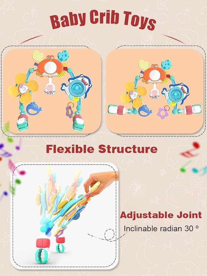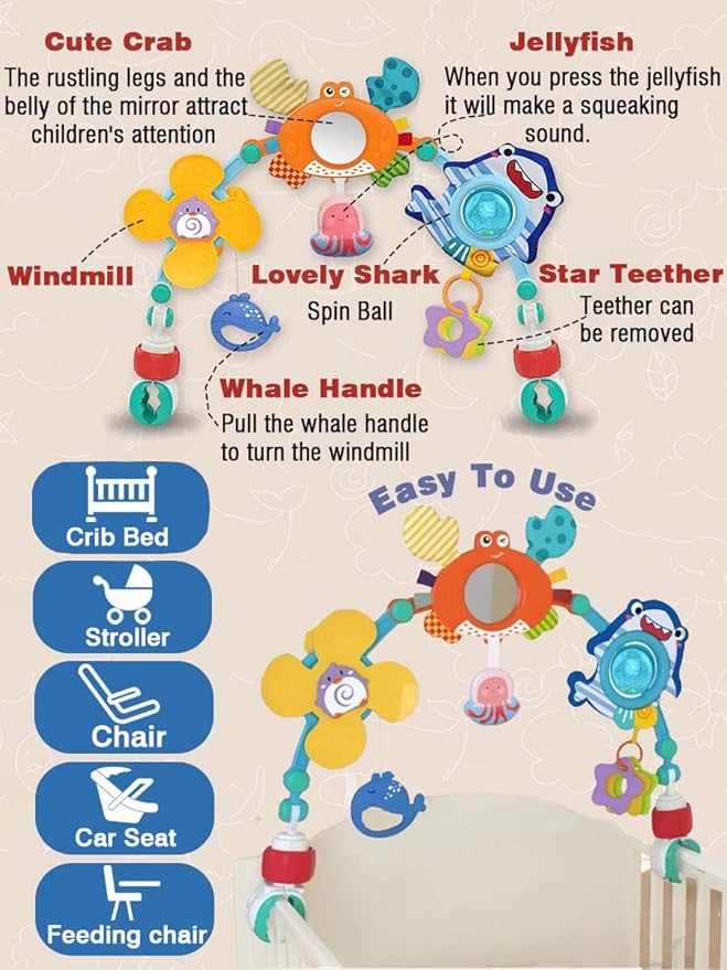 • Carseat toys for infants 0-6 months,Stroller toys have variety of graphics,Penguin Windmill.Whale Handle.Star teether.Cute crab have rustling legs and the belly of the mirror attract children's attention.Bullt-in BB squeaker in the Jellyfish press to make a Bi~ Bi~ sound.Lovely Shark colorful rotating ball rattle.