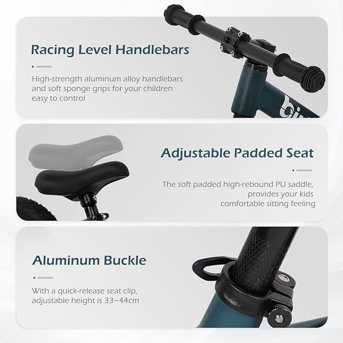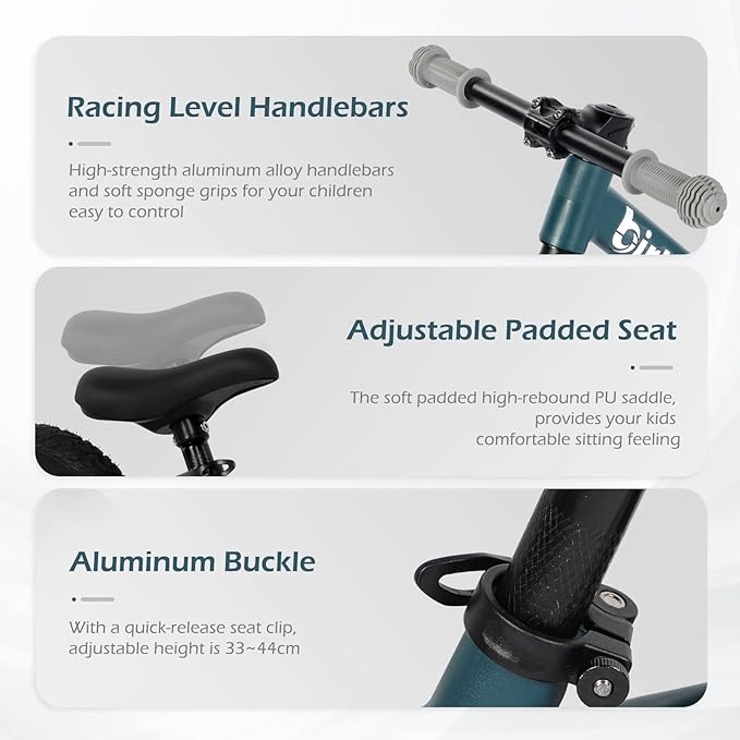 • HANLERBAR AND SEAT - Racing level non-slip handlebars for safe and comfortable ride. Adjustable seat with a height from 13 inches to 17.3 inches, can be set for kids according to their height. The aluminum quick release seat clamps allows for No Tool saddle height adjustments. A U-shaped footrest wrapped on both sides, allowing kids to relax their foot while on a bike ride.