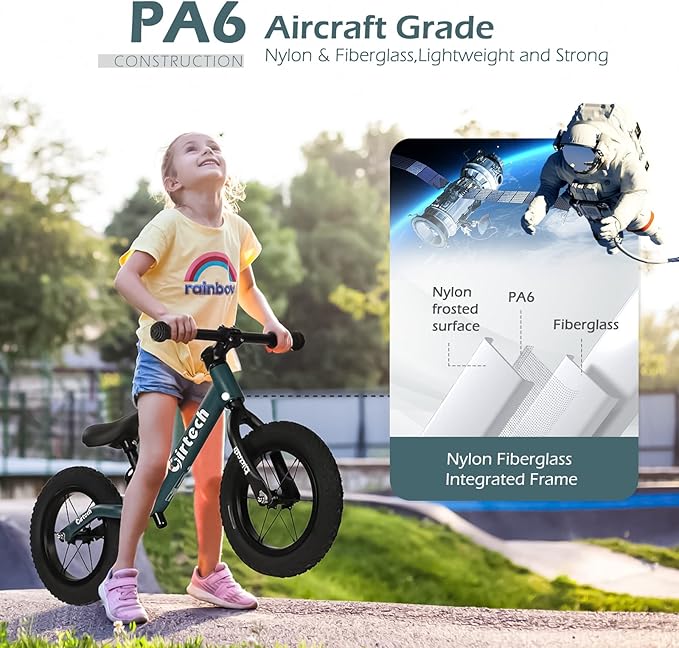 • INTEGRATED NYLON FRAME - Constructed of Aircraft Grade PA6 and fiberglass integrated molding, Frame constructed in one piece without any welding brings a smooth and beautiful appearance. The nylon frame is sturdy and lightweight., weights 6.4 lbs, the lightweight balance bike frame design makes the bike easier to control for kids.
