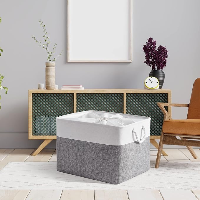 • 【ARTISTIC】: TheWarmHome Fabric Bins had great storage capacity and stylish. Minimalist design and neutral color exterior fabric can be integrated into any home decorations and styles. White cotton rope handles on the sides add a nature touch. The storage basket is like an art, not only provide a solution to many storage needs make home keep clean and tidy, doubles as a charming decoration. TheWarmHome, WARM YOUR HOME.