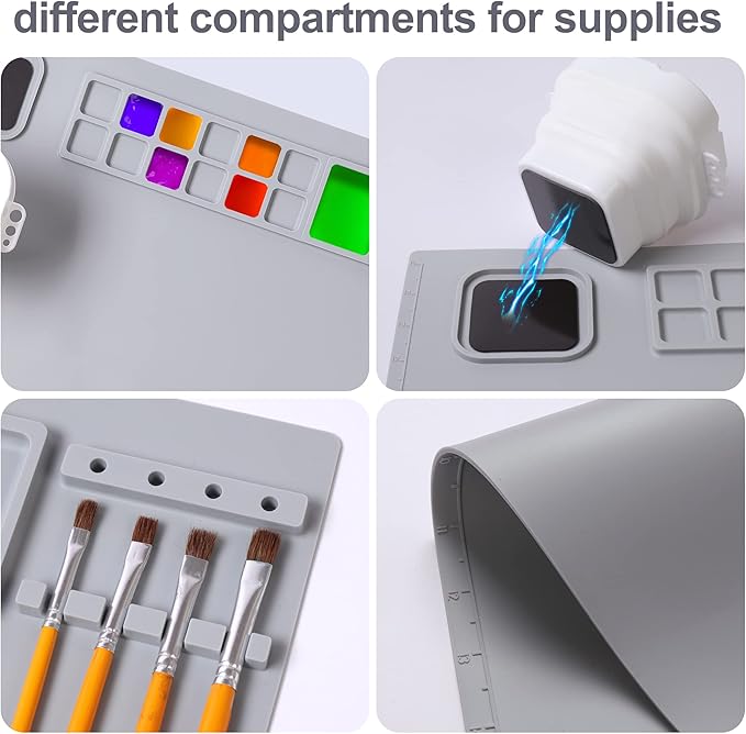 • [UNIQUE DESIGN] - Silicone painting mat has a collapsible attached cup with brush holders on the side and top, built-in paint wells, and brush rests. Keep clean while creating efficiently.