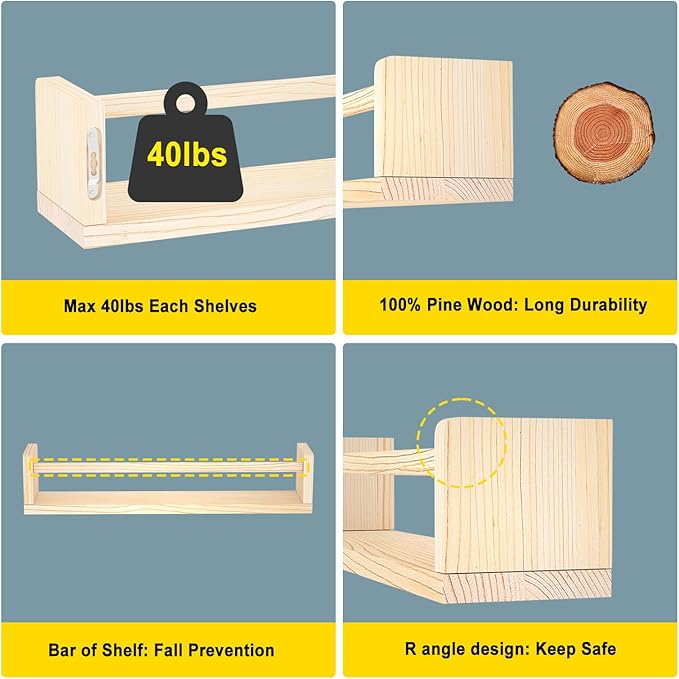 • Natural Wood Finish: Made of strong natural wood, these floating book shelves for kids room are durable and stylish, enhancing the decor of any room.