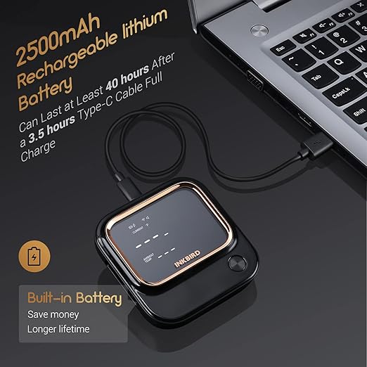 • 【Different Level Deluxe Design & Readable Backlit LCD Screen & Rechargeable 2500mAh lithium Battery】The bbq thermometer with luxury and outstanding design. The screen brightness can be adjusted via the app, the temp data are clear even under the sun. The large LCD screen displays the meat probe readings, ambient/oven temp, the setting temp, high/low temp alarms simultaneously. The built-in battery oven meat thermometer will last at least 40 hours after a 3.5 hours type-C cable full charge