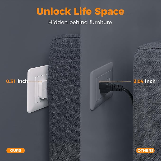 • Flat Extension Cord: With only 0.31 in ultra thin flat head design, extension cord flat wall plug can easily fit in tight spots and hide behind sofa, bed, nightstand or other furniture, sitting flush against the wall; 45 degrees right angle design creates an extra space for other plug below without blocking