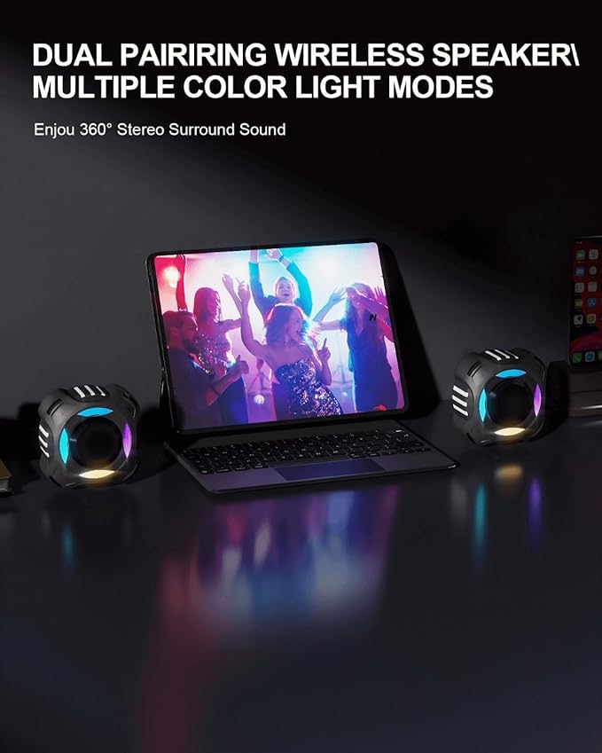 • [MULTIPLE LED LIGHT MODES & A2DP BLUETOOTH 5.3]- Simply press the "Light Button" to enable the colored lights and press again to switch the light mode to make your party more fun. Start the party with powerful sounds and rock the party with multi-color flashing lights. Perfect for use in family parties and take to pool parties or beach parties. Wireless speaker uses Bluetooth 5.3, A2DP technology, which means lower power consumption, faster transmission, no delay in calls.