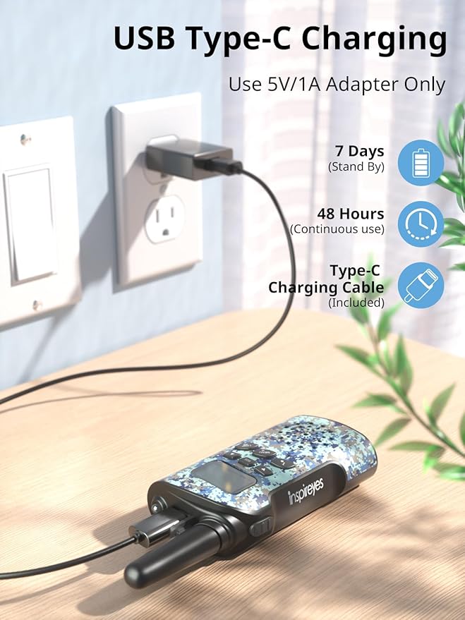 • Inspireyes rechargeable kids walkie talkies are rechargeable and long lasting, featuring an upgraded built-in lithium polymer battery. There is no need to buy extra AAA batteries. Kids can enjoy up to 48 hours of playtime and 7 days of standby on a single charge.