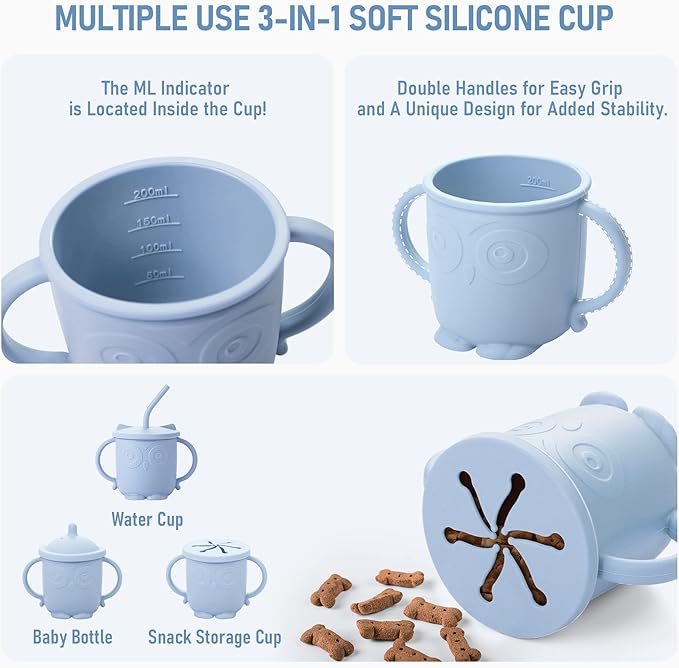 • Unique Designed Toddler Feeding Set: The baby spoon and fork in the infant weaning set are designed according to human mechanics, and the size is just suitable for babies aged 4 to 48 months; The matching silicone cup with 3 lids can not only serve as a baby bottle, also as a water cup and snack storage cup, babies can easily learn self-feeding skills using our silicone cup set.