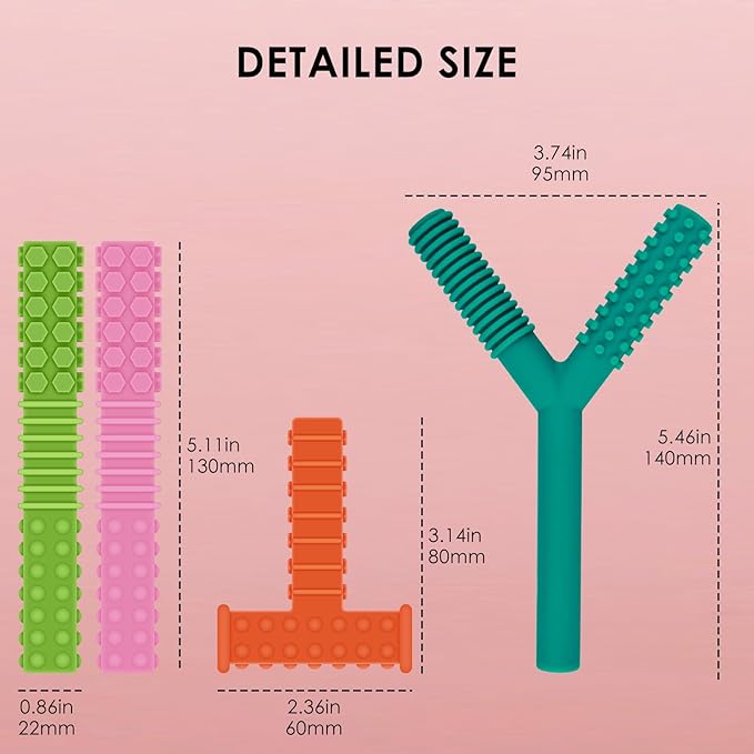 • FUN TEETHING TOYS: Our sensory teething toys set includes 1 pcs T shaped, 1 pcs Y shaped sensory chewy toys and 2 pcs teething tubes, helps keep your kids from chewing on fingers, pencils, hands, clothes, hairs, etc. Reducing stress, anxiety especially when they need to soothe, calm, or focus