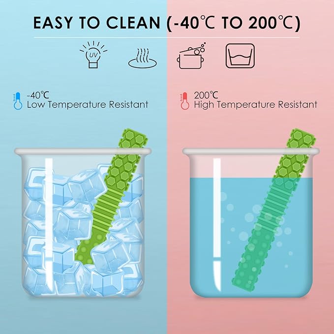 • EASY TO CLEAN: very easy to clean, just wash the sensory chewing toys with soapy water, or wash it with dishwasher. Our teethers for babies can be sterilized by boiling water, steam sterilizer and sunlight. -40℃ to 200℃ Temperature resistant, we suggest cleaning it before first use and after each use