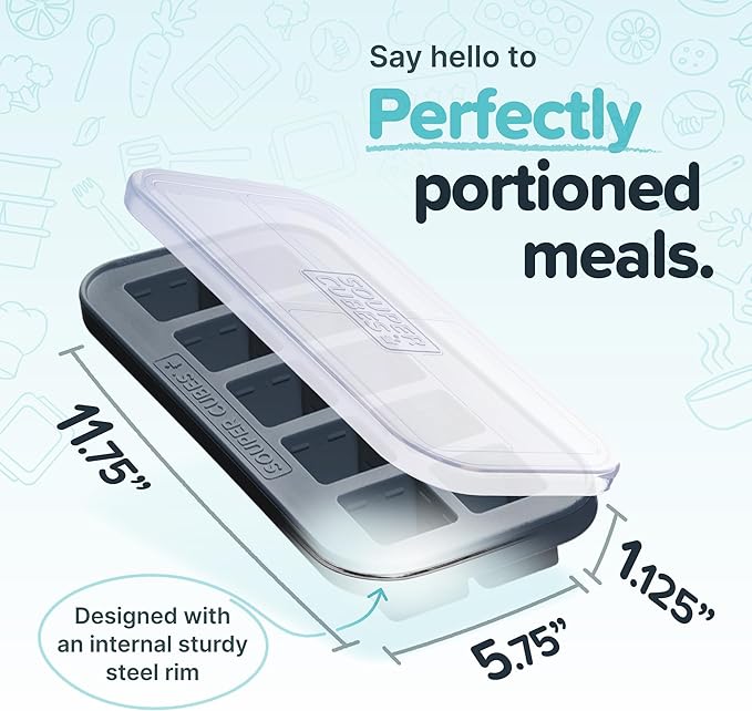 • MEAL PREP: Spend less time thinking about what you're going to eat and more time enjoying it. Our silicone freezer tray with lid is designed to make meal prep a breeze. The tray is made from 100% pure platinum food-grade silicone with a steel-reinforced top and a convenient lid.
