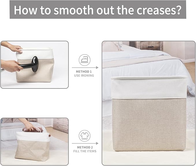 • 【Maintenance & Care Tip】 - Collapsible design for space saving. Our foldable baskets comes in a compression packing which may result in wrinkled storage bin during the long transit. Get rid of the wrinkles by either stuffing the fabric storage bins with blankets and pillows for a few days or steam iron them at low-heat setting. The organization baskets are easy to clean, you can dust the basket with a soft cloth with light soapy water when needed. Not recommended to machine wash.