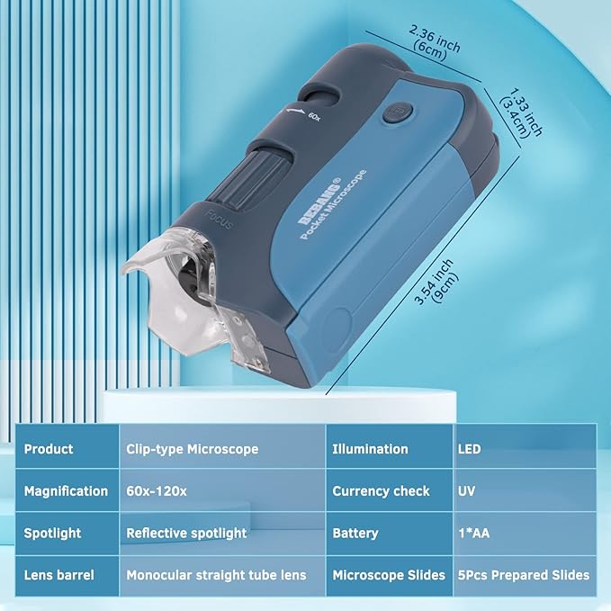 Pocket Microscope, 60x-120x Handheld Mini Microscope Kids with LED Lights, 5 Slides Specimens, BEBANG Portable Microscope for Kids Student Adults Microbiological Observation Lab Study, Educational Kit