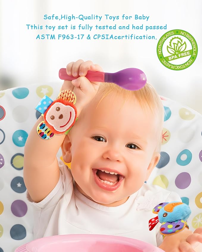 • CUTE DESIGN -- All Wrist Rattles and Foot finder socks have bells inside, wrists rattles attach with simple hook and loop, easy to put on and off. Baby socks with breathable and soft knitted fabric,very comfortable for little babies to wear.