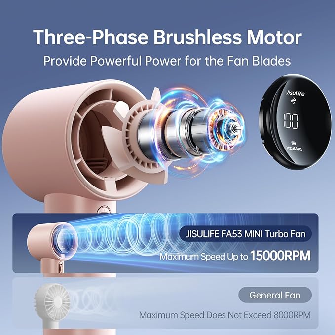 • Brushless Motor - Super Power: The combination of a three-phase brushless motor and a 3600mAh battery significantly improves the wind speed, power, and endurance. The maximum wind speed can reach 9m/s. The highest rotation speed of the handheld fan is three times that of a regular personal fan, reaching up to 15000 RPM. It can cool for 2-12 hours on a single charge