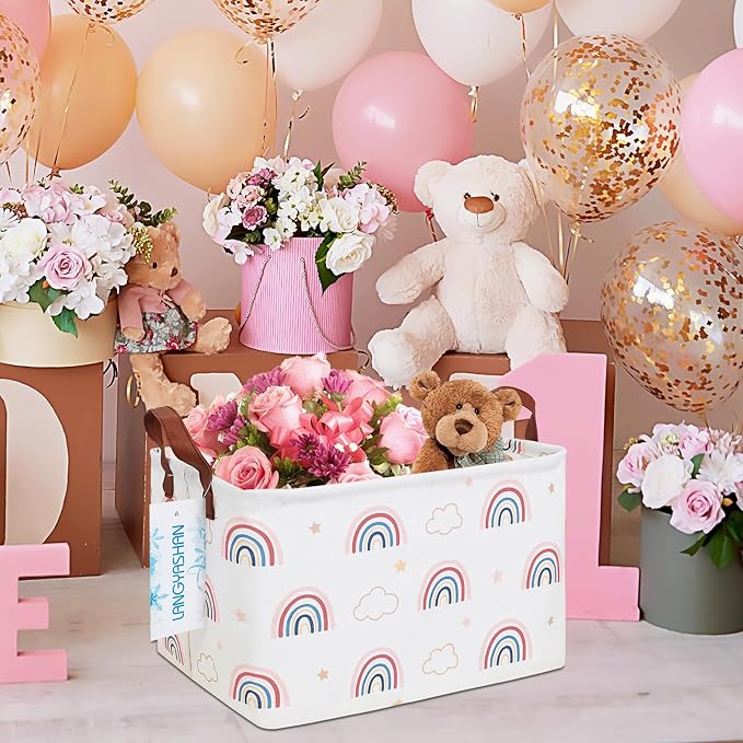LANGYASHAN Rectangular Storage Bin Collapse Canvas Fabric Cartoon Storage Basket with Handles for Organizing Home Kitchen Boys and Girls Toys Office Closet Shelf Baskets(Rec Cloud Rainbow)