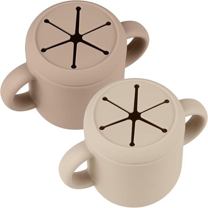 Snack Containers, Silicone Snack Cups for 6-12 Months Toddlers - Pack of 2 Food Grade Silicone Snack Cups with Grip Handle for Baby Led Weaning, Unbreakable (Sand/Natural)