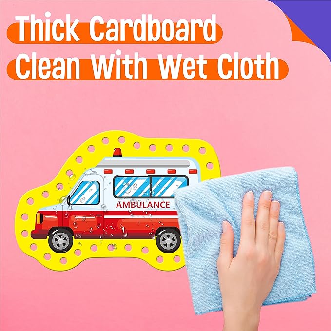 • Bright-colored & Eye-catching: The pattern covers different vehicles, like taxi, school bus, fire truck, police car, ice cream truck, bus, truck and ambulance. The patterns on cards are colorful, big and vibrant. The holes are clearly cut and easy for preschoolers to work with. The strings are easy for children to use and fit into the holes easily.