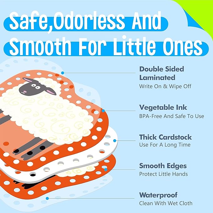 • Premium Material: The lacing cards are made of sturdy cardstock, durable and handy. Double side printed with premium plant ink, non-toxic and no odd smell, safe enough for toddlers’ use. The laces are made of quality polyester, which is not simple to break, and can serve you for a long time.