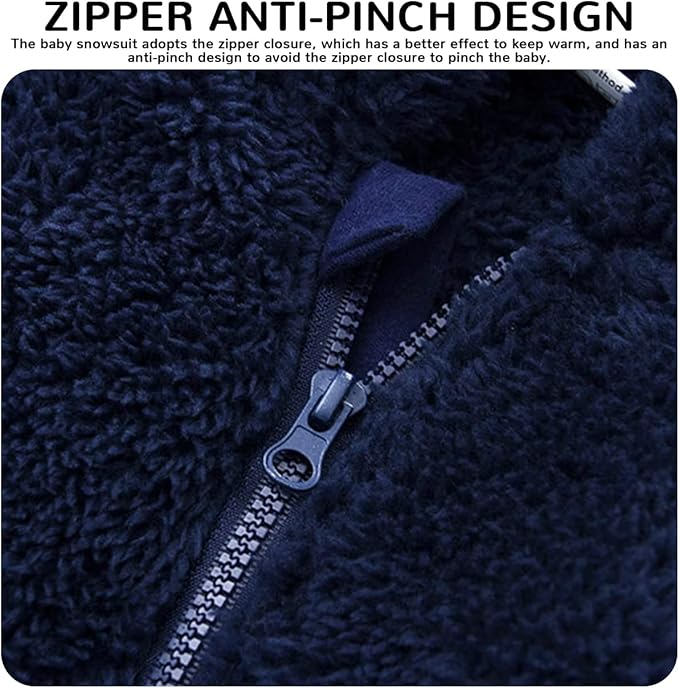 • ❤♥Design: Baby fleece snowsuit jacket warm one-piece jacket, full-cover zipper design to protect the baby from harm, one pull to the end, it is convenient for the baby to change diapers, the flip-up gloves can keep the baby warm and energetic at the same time, the bear ear one-piece cap makes the baby Avoid cold winds outdoors while increasing your baby's charm.