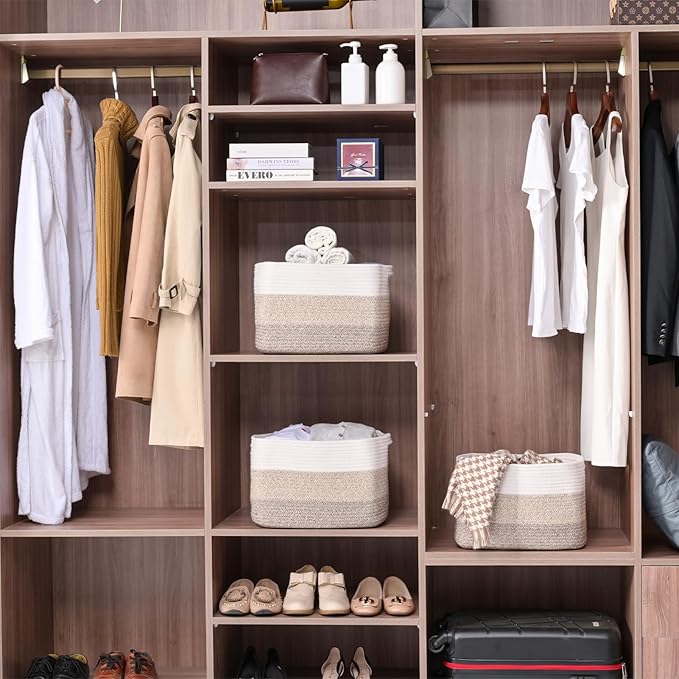Storage Baskets for Organizing Shelves, Woven Cotton Rope Bins for Baby Nursery Organization, Book Toy Towel Organizer, 15"x11"x9.5", 3 Packs, Gradient Brown