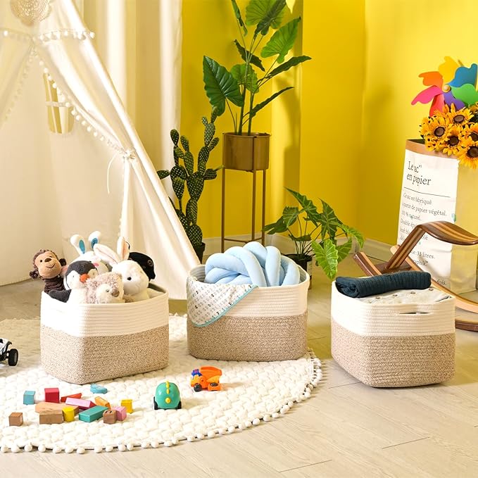 Storage Baskets for Organizing, Woven Cotton Rope Basket for Storage Books, Baby Organizing Baskets, Toy Storage Basket, 15"x11"x9.5", 3 Packs, Off White & Brown