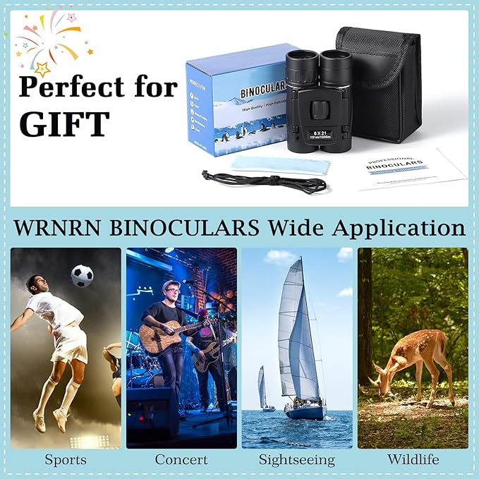 • 【Wide & Clear Vision】WRNRN 8X21 binoculars has 8X magnification and 369ft/1000yds large field of view. Use quality BAK4 Prism and FMC Green Lenses to inscrease the light transmission up to 98.5%. You can easily gain a better brightness, contrast and quality image.