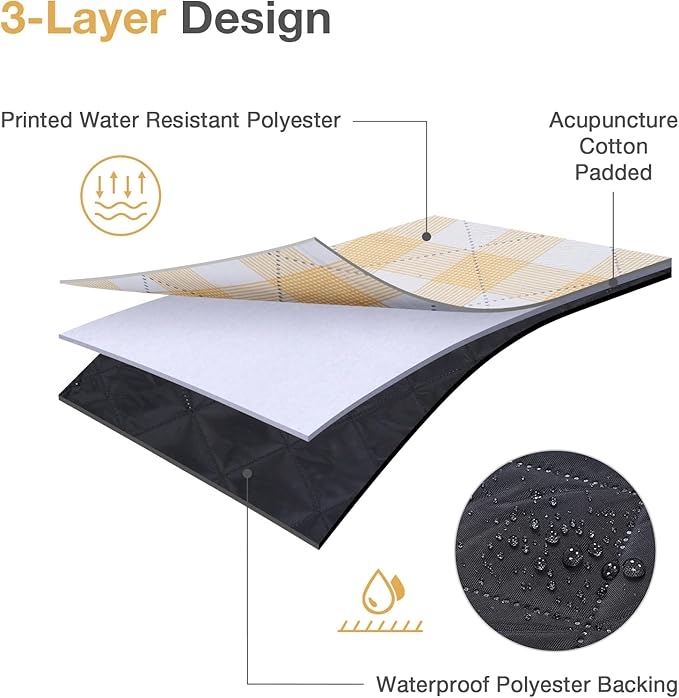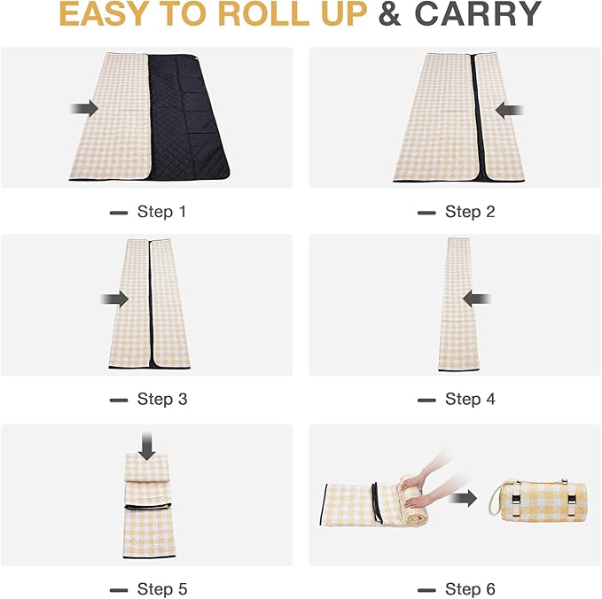 • HIGH QUALITY FABRIC: The top fabric is made of durable polyester, and printed with classic neutral yellow white check, the color printed is safe and fastened, not easy to fade as time goes. The soft cotton padded in the middle, making the picnic blanket soft and comfortable to sit and lie down.