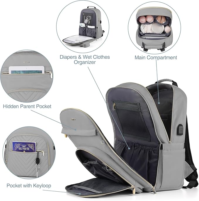• Upgraded handy structure: The diaper bag backpack has 20 pockets, 2 insulated bottle pockets can hold most of wide neck or tall baby bottles from 5 oz to 11oz, never lose your keys and wallet in the hidden mommy pocket, hideaway pocket in the back for stashing phone or wallet, with all sorts of useful pockets, you get well layered compartments to keep wet and dry nappies or clothes separate.