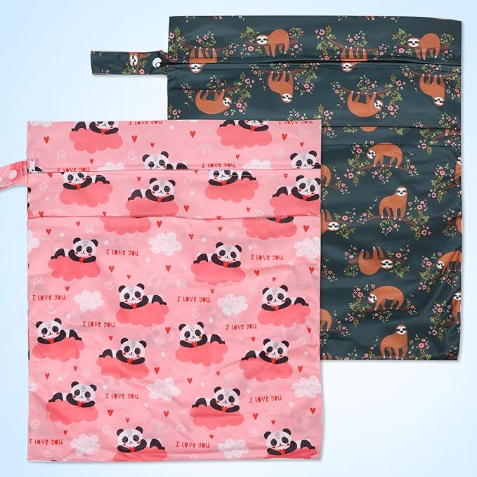 • 2 ZIPPERED POCKETS & HANDLE DESIGN: The 2 pack laundry bags are designed with 2 zippered compartments to keep wet and dry clothes separately, or separate dirty and clean diapers. Keep dry and clean. There's a handle with a button on one side for hanging up, convenient to carry and attach to your stroller, doorknob, towel rack, hook or handbag.