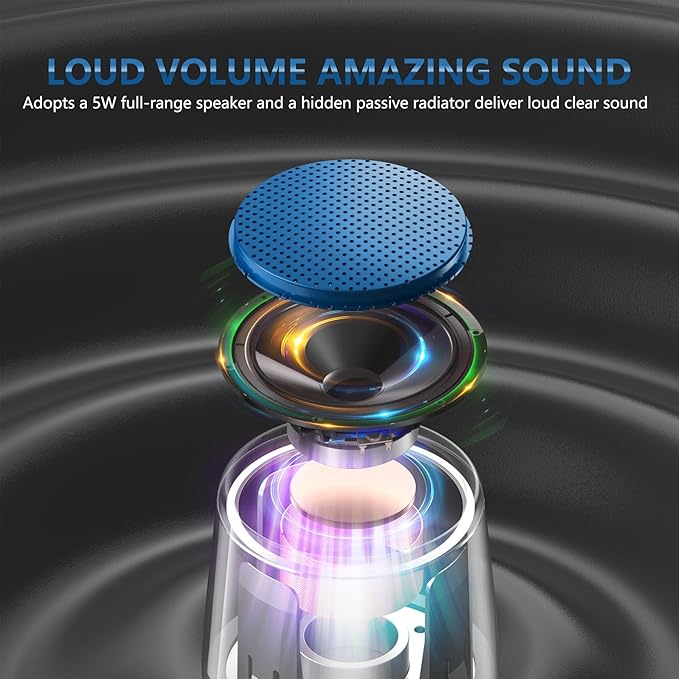 • 【Small But Mighty Powerful Mini Speaker】 This micro travel waterproof speaker packs a far more powerful punch than its small size would suggest. It adopts a 5W full-range speaker and a hidden passive radiator on the bottom to deliver surprisingly rich audio and clear sound. Wireless computer speaker without cable hassle for pc laptop, tablet, and smartphone. One of the best gift ideas.