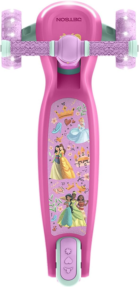 • Glitter and glow: Glittery, light-up wheels and a frame that sparkles with multicolor LED lights make this scooter show-off worthy.