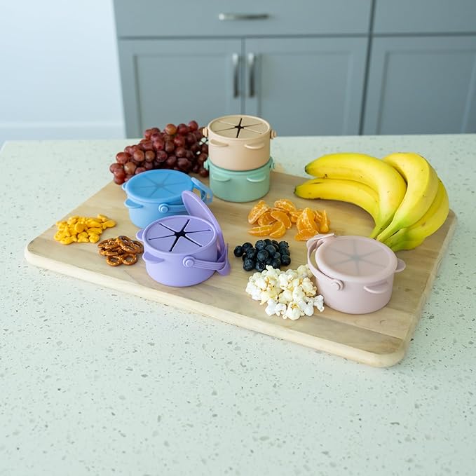 • Munch on the Move with Ease: Our 4.2” silicone snack cup promises easy handling and effortless on-the-move munching; The petal-like opening on these baby snack cups welcomes those little fingers, making snacking a breeze every time