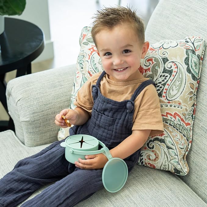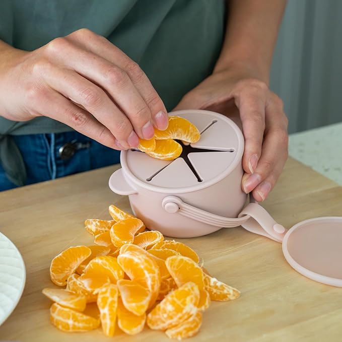 • Munch on the Move with Ease: Our 4.2” silicone snack cup promises easy handling and effortless on-the-move munching; The petal-like opening on these baby snack cups welcomes those little fingers, making snacking a breeze every time