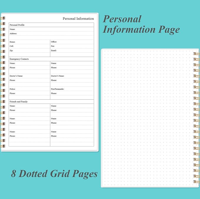 • A5 SIZE - This undated daily organizer size of 8.5 x 5.8 inch, perfect size to fit in your bag.1 quick reference page, contact pages, important dates page, and 75sheet (150 page) daily plan & notes,8 dotted grid pages, Undated appointment planner makes it easy for you to start the planner at any time.
