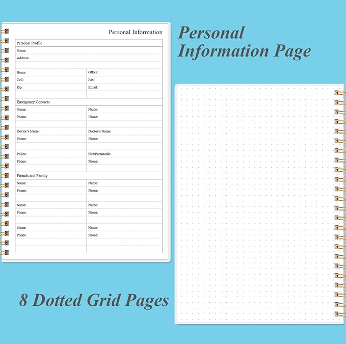 • A5 SIZE - This undated daily organizer size of 8.5 x 5.8 inch, perfect size to fit in your bag.1 quick reference page, contact pages, important dates page, and 75sheet (150 page) daily plan & notes,8 dotted grid pages, Undated appointment planner makes it easy for you to start the planner at any time.