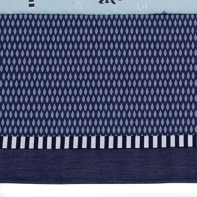 • Coordinating crib skirt in a pretty navy print with a vertical stripe