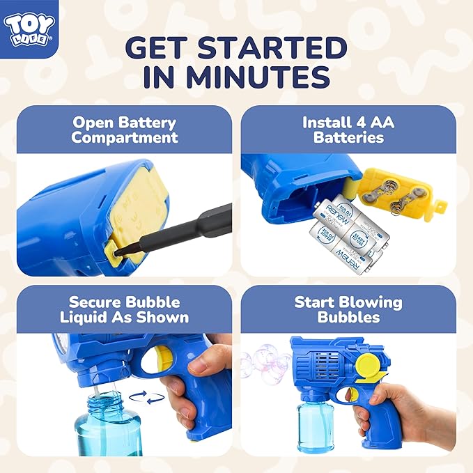 • Quick & Easy Battery Setup: Simply insert 4 AA batteries (not included) and start blowing a steady stream of bubbles instantly.