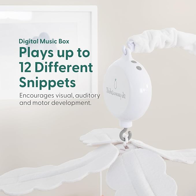 • Versatile Melodies: With a digital music box that offers 12 different lullabies, you can easily change the song to suit your baby’s mood. The handy volume control lets you keep it soft or a little louder.