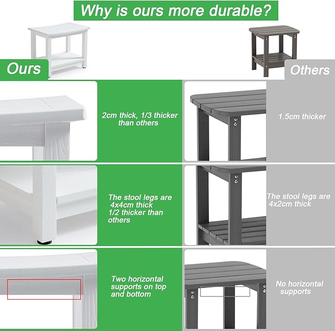 • 【Easy to Assemble】The plastic shower bench seat comes with all hardware you need to assemble, and the most important is the screws of the bench is invisible, not like other's bench all screws are visible