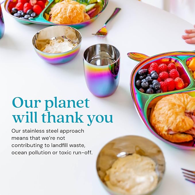• Kid Approved — Ahimsa Mindful Mealtime Sets make mealtime fun with vibrant and colorful stainless steel kids plates that children adore. Included is a stainless steel toddler plate with dividers, a 8 oz. kids stainless steel cup and small baby bowl, and kids silverware (1 kid fork, 1 kid spoon).