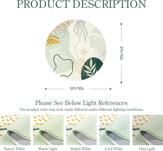 Lahome Boho Round Area Rug - 3Ft Washable Non-Slip Bathroom Rug, Green Botanical Print Carpet for Bedroom, Living Room, Entryway
