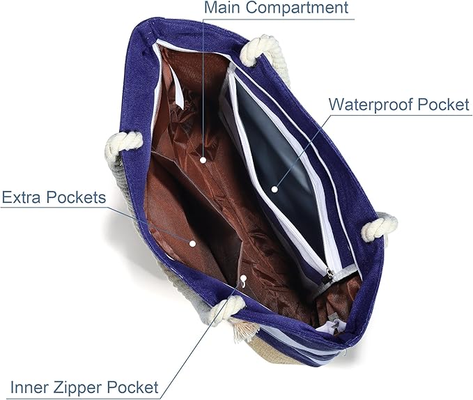 • 【ZIPPER AND INNER LINING : The lightweight and foldable cotton beach tote bag is easy to clean and carry. It features a top zipper closure & inner lining design. Perfect for travel, beach, vacation, swim pool bag, work bag, weekend bag, cruise must haves, everyday bag, etc