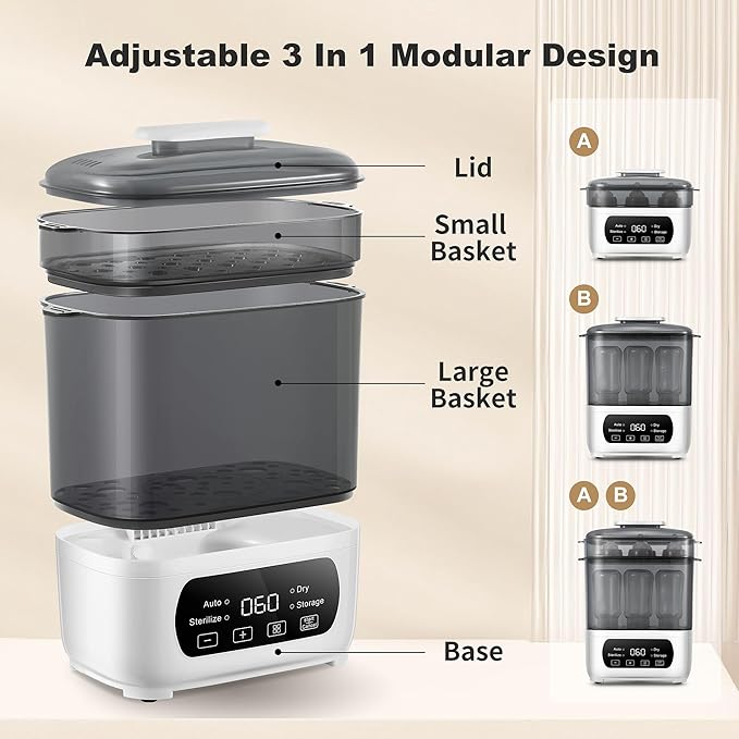 • 【4 in 1 Multi-function】This bottle dryer is designed with a fully automatic operation and LED countdown display, you can steam only, dry only, steam and dry, and 72-hour secure stroage, convenient for busy parents. The small basket and large basket can be freely and flexibly combined to save space and meet your needs.