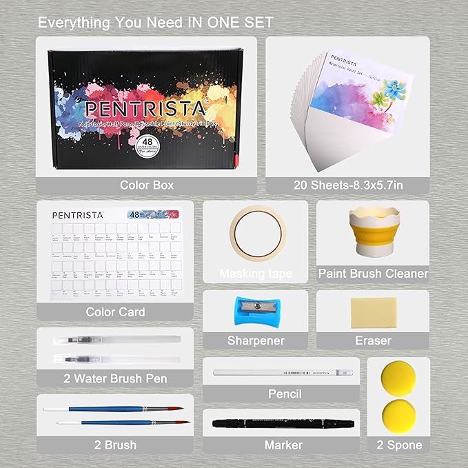 • 🎨 【Portable Watercolor Kit】- Travel paint set watercolor comes with 48 water color paints and color card, The solid watercolor travel set come with a Portable tin box that has watercolor palette,20 sheets of watercolor paper, 2 artists quality water brush pen,2 round sponge, 2 exclusive water brush pens, 1 pencil 1 eraser 1 sharpener, 1 Paint Brush Cleaner, 1 adhesive tape.Comes with all the tools you need to paint for adults to enhance their painting skills and techniques.