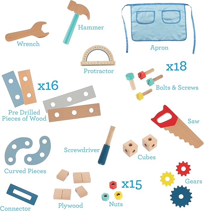 • Contents include: Work apron, hammer, saw, wrench, screwdriver, protractor, 18 bolts & screws, 16 pre drilled pieces of wood, 2 pieces of plywood, 2 cubes, 2 curved pieces, 15 nuts and 3 gears. Also includes a spinning turn saw, plywood with velcro to saw apart, a storage drawer and steering wheel